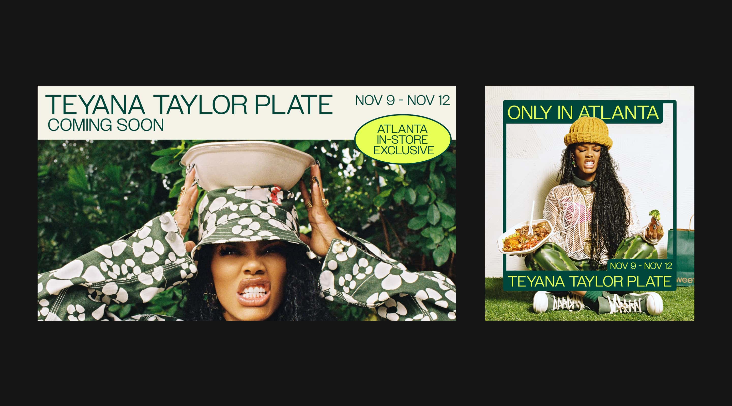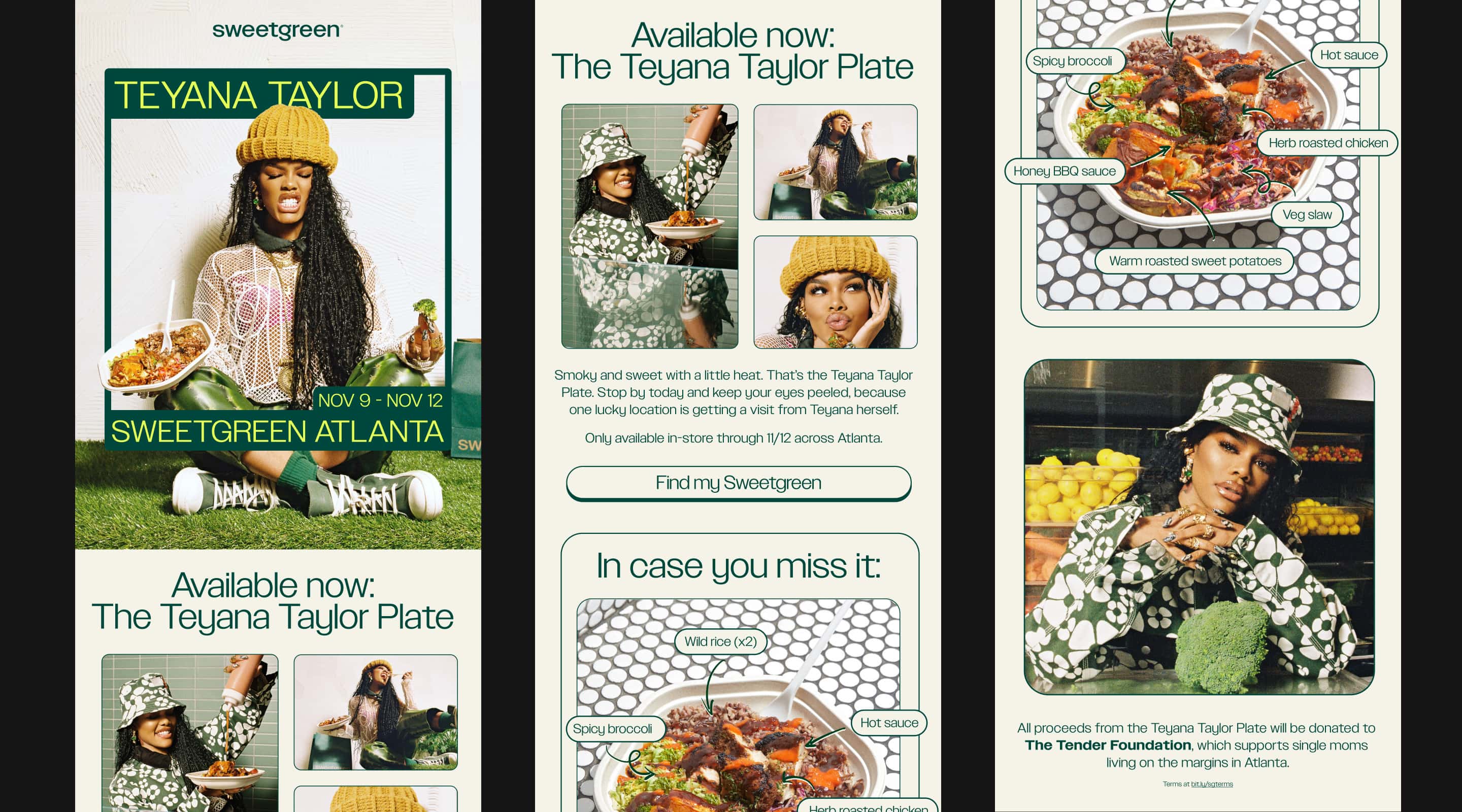 To reignite the Atlanta market at Sweetgreen, we collaborated with Teyana Taylor to create a custom protein plate that would only be available for one weekend. We always want our partnerships to positively influence the community so we included a additional charity piece with a portion of the proceeds going to Taylor's foundation The Tender Foundation.